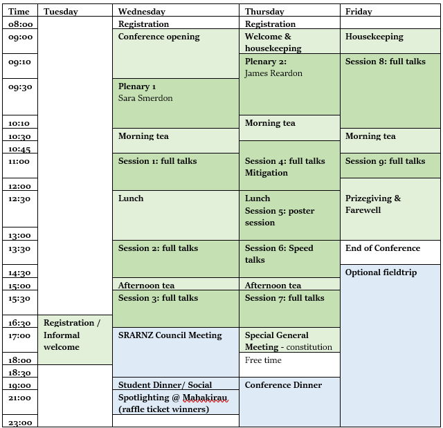 All speakers have been notified of the date and time of their talk – please contact srarnz.conference@gmail.com if you are a speaker and have not heard from us. Please save your presentation as “session_number-surname-2026.pptx” and bring a copy of the file to the conference on the day to be uploaded. Presentations can be uploaded on the morning of your talk, before the first session starts for the day, or during lunch.